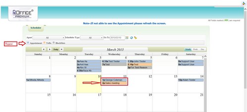 Also other type of activity can be filtered by selecting the specific type in the scheduler type drop down menu. They are: Appointment, To Do, and/or Block Slot. User would need to click on the refresh button