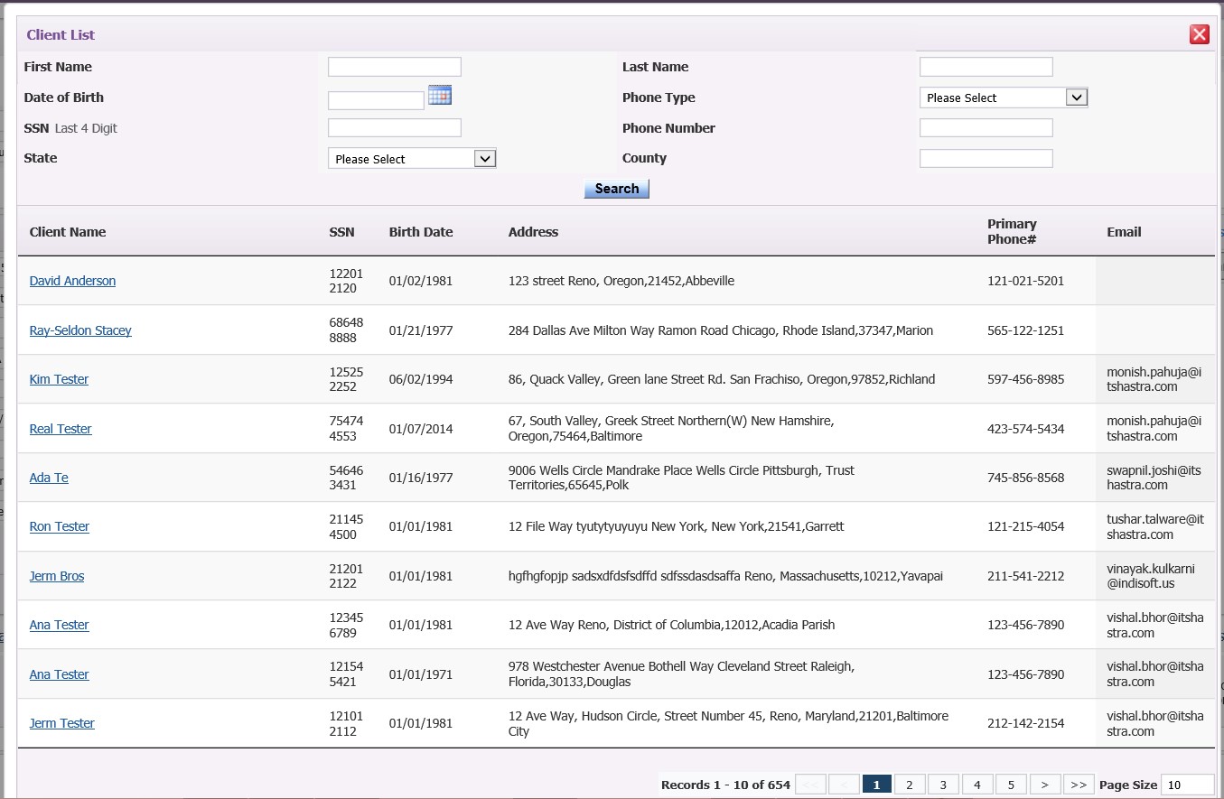 Also on the Client List screen, the counselor has the option to search for client by entering certain search criteria and clicking on the search button, if client does not appear in the main list.