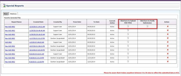 Step #3: Submitting the HUD 9902 ReportWhen it is time to submit the HUD 9902 report, the user would need to return to the HUD9902 screen and click on History and click on the report icon under the HUD Report Submitted column for the report that needs to be sent as seen below:
