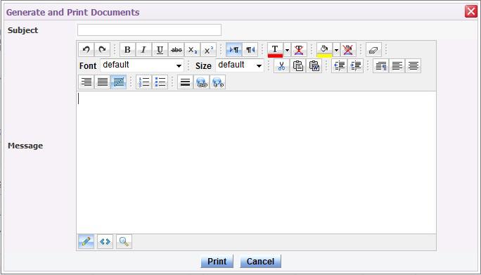 The above screen will only appear if a client did not provide an email address initially to counselor, which the system will recognize. Counselor would enter Subject, Message, and click on Print button. Once the documents have printed, counselor would need to mail them directly to client.