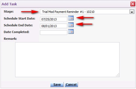 Role Privilege Trial Modification Payment Reminder #1Once the above screen appears, the Counselor can start to set-up the reminders by selecting the Trial Mod Payment Reminder #1 from the Stage drop down menu and then enter the schedule start date and schedule end date as indicated below, so the message will be received by the Borrower. (The message is sent to the Borrower, before the number of configured days of schedule end date, which is currently configured at 7 days)